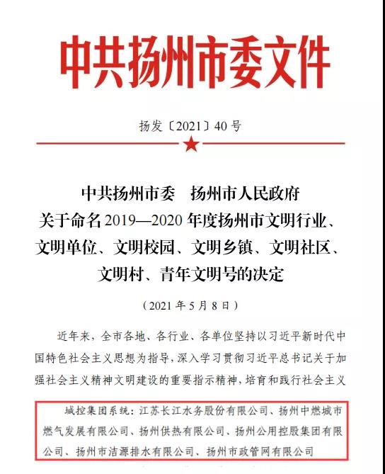 近日,市委、市政府發(fā)布《關(guān)于命名2019—2020年度揚(yáng)州市文明行業(yè)、文明單位、文明校園、文明鄉(xiāng)鎮(zhèn)、文明社區(qū)、文明村、青年文明號(hào)的決定》,城控集團(tuán)所屬江蘇長(zhǎng)江水務(wù)股份有限公司、揚(yáng)州中燃城市燃?xì)獍l(fā)展有限公司、揚(yáng)州供熱有限公司、揚(yáng)州公用控股集團(tuán)有限公司、揚(yáng)州市潔源排水有限公司、揚(yáng)州市政管網(wǎng)有限公司等6家單位榮獲“市級(jí)文明單位”稱號(hào)。